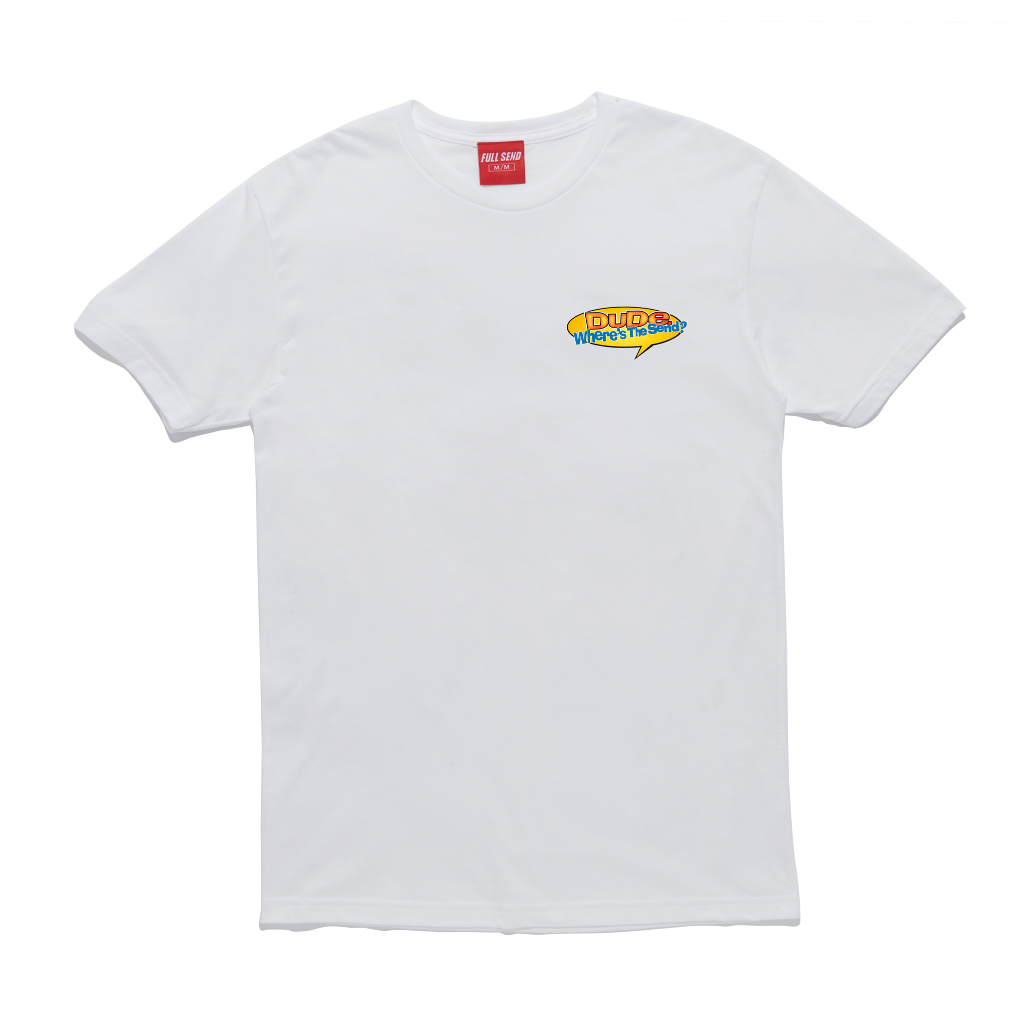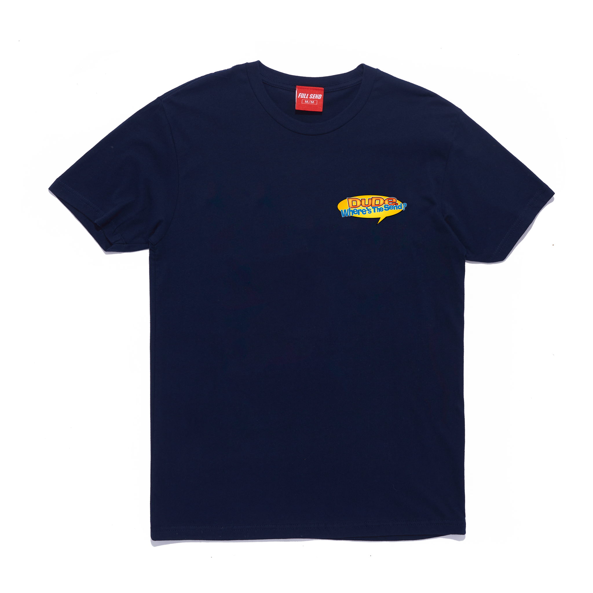 • Dude Where’s the Send screen printed on left chest